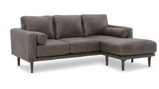 For a fresh spot in your space, turn to this sofa chaise. The invigorating piece breathes warmth into your home with its soothing smoke-colored faux leather upholstery, modern bolster pillows and tapered legs.