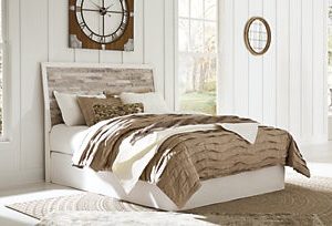 An urban sleek aesthetic with a touch of the great outdoors. That’s the beauty of the refreshingly different Evanni headboard. A vintage white finish is blended with replicated gray wood grain with butcher block design for a dual serving of style. Simply irresistible.