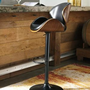 Style takes quite a modern turn. Sporting a distinctively contoured back and seat design, this upholstered swivel bar stool is sure to bring an elevated look to your living space. Wrapped in a black faux leather upholstery, the seating area’s artful contours are accentuated with a faux wood finish.