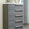 An urban sleek aesthetic with a touch of the great outdoors. That’s the beauty of the refreshingly different Evanni chest of drawers. A vintage white finish is blended with replicated gray wood grain with butcher block design for a dual serving of style. The chest’s long, linear drawer pulls in a gunmetal finish are cool and eye-catching.
