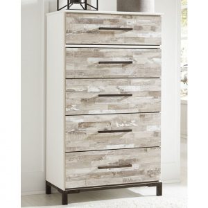 An urban sleek aesthetic with a touch of the great outdoors. That’s the beauty of the refreshingly different Evanni chest of drawers. A vintage white finish is blended with replicated gray wood grain with butcher block design for a dual serving of style. The chest’s long, linear drawer pulls in a gunmetal finish are cool and eye-catching.