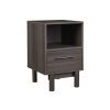 The perfect marriage of contemporary and casual style, this nightstand is a charming addition to your home. This nightstand is expressive with its two-tone look in matte white and a replicated sugarberry wood grain pattern. White knobs and splay legs add a finishing touch, while the open shelving allows for extra storage.