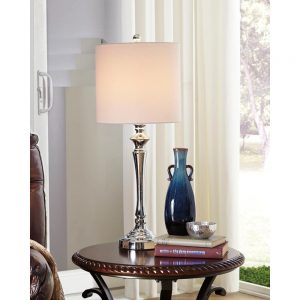 A shiny chrome base reflects this metal table lamp’s gleaming light in such a stunning way. Add the chic drum shade and you have a look that’s sleek, clean and completely contemporary.